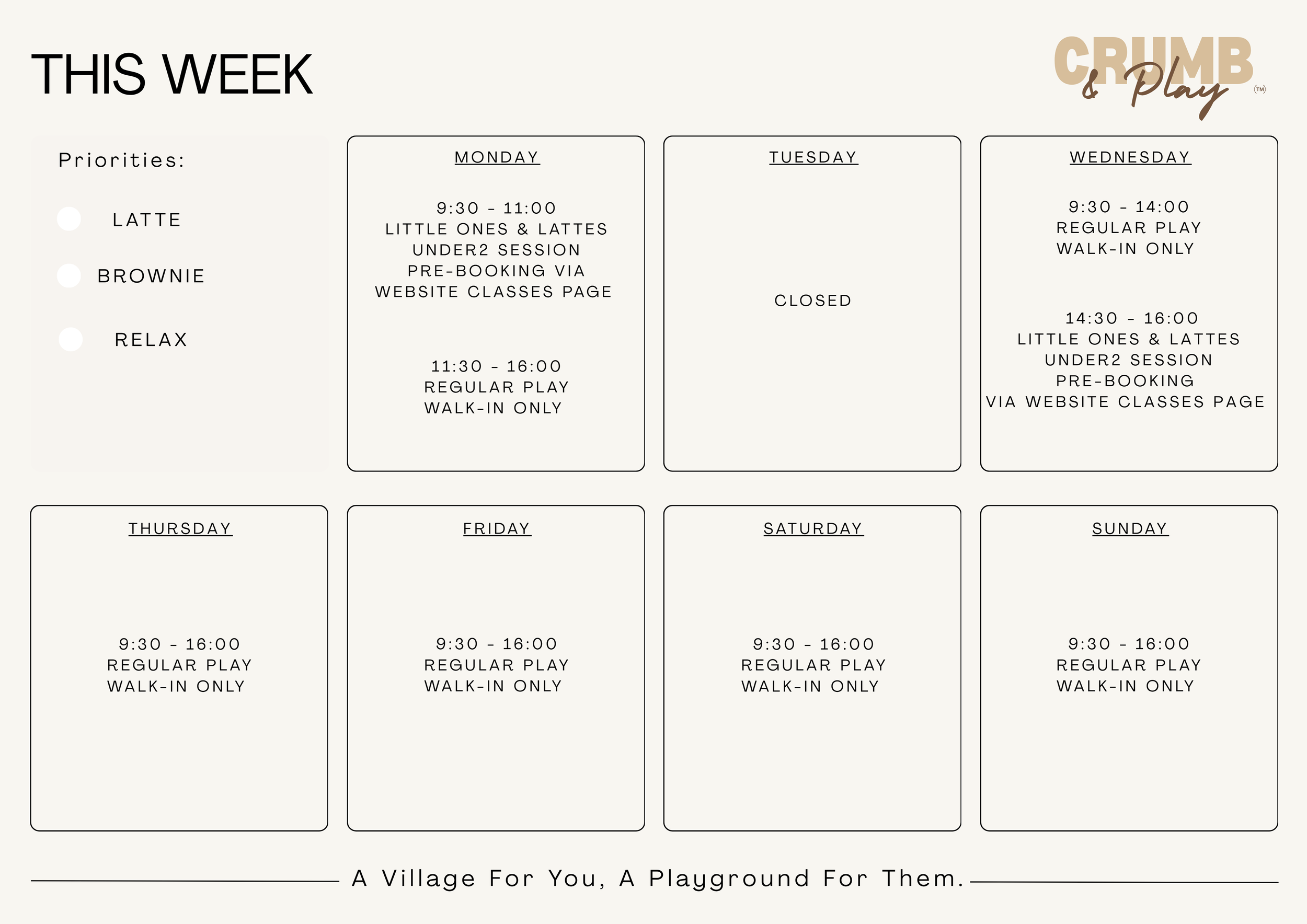 We are walk - in only at our Play Cafe for everyday play. Just pop along at a time that suits you for 90 minutes of play!